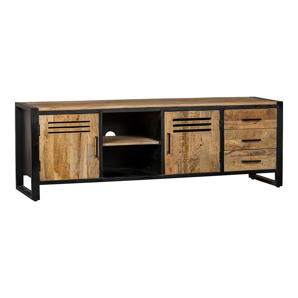 Nábytek je cool kombinací mangového dřeva a černé oceli. Za dvířky je dostatečný úložný prostor a na policích je dostatek místa pro přijímač nebo herní konzoli.