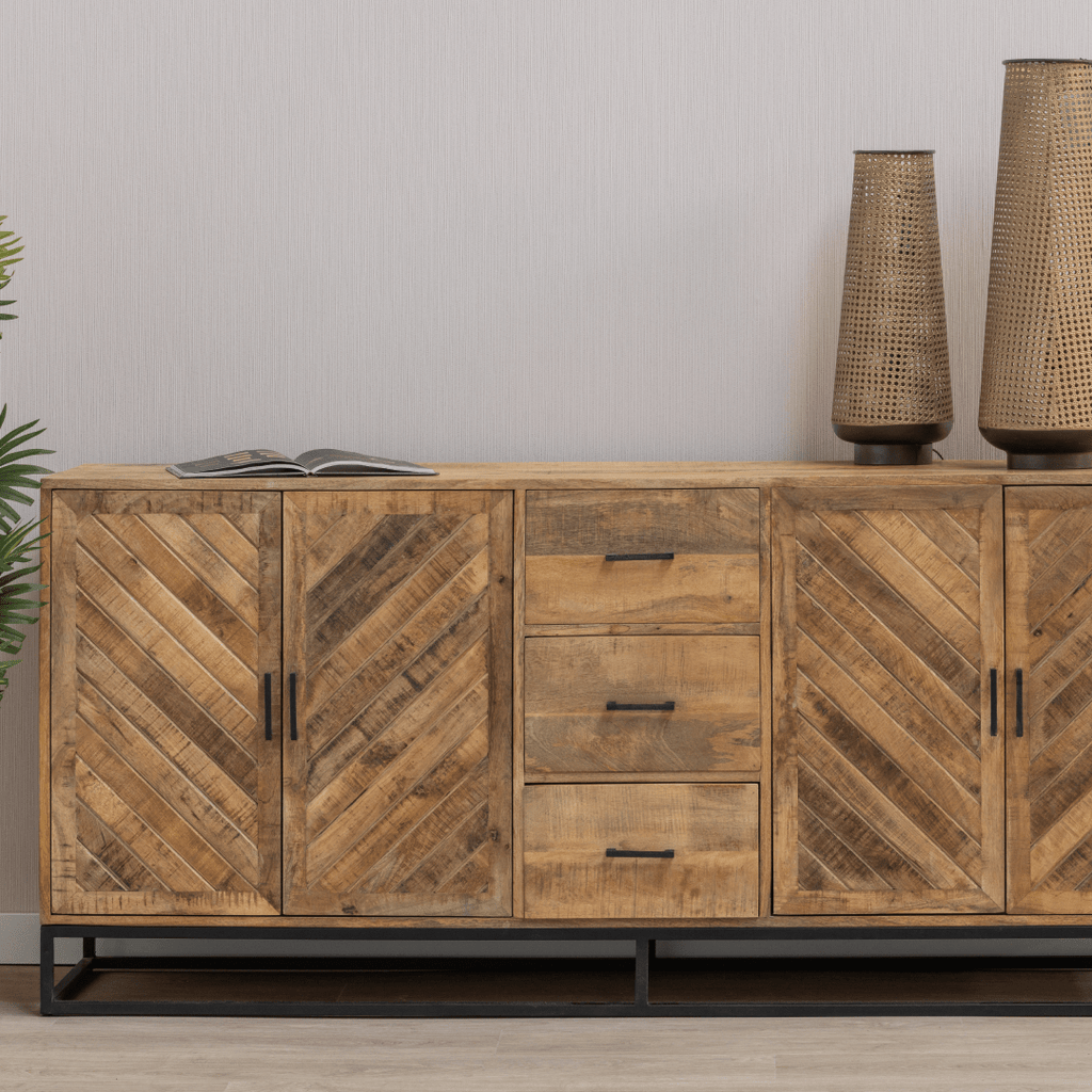Komoda Reno je ideální pro Váš domov nebo kancelář! Nejen pro její houževnatý, robustní charakter, ale zejména pro řadu možností uložení. Nábytek má dvě prostorné přihrádky za každými dvěma dvířky se třemi prostornými zásuvkami mezi nimi, takže nábytek je ideální pro uložení všech druhů věcí.