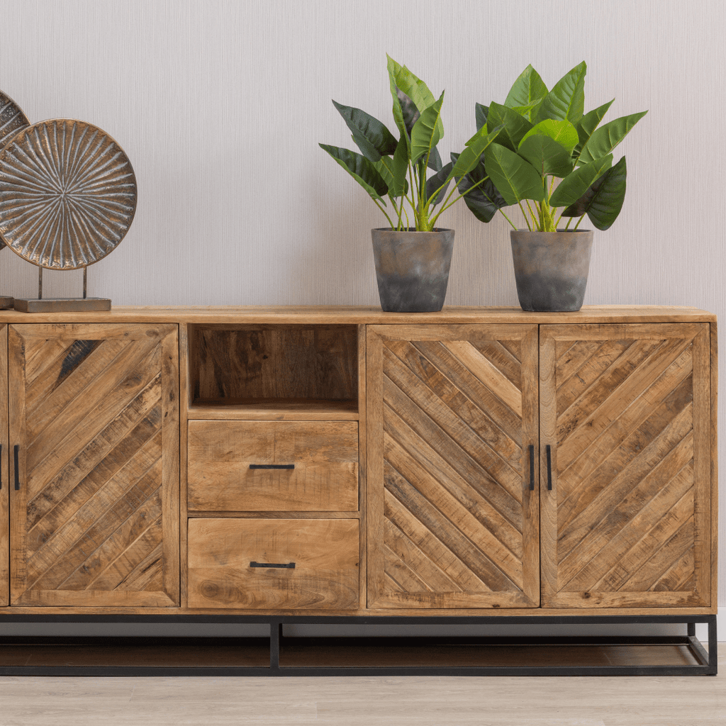 Na masivní mangové dřevo je naneseno několik vrstev oleje na dřevo a čirého přírodního včelího vosku na ochranu dřeva před vlhkostí, nečistotami a kroužky. Rám a rukojeti jsou vyrobeny z kovu s černým práškovým nástřikem.