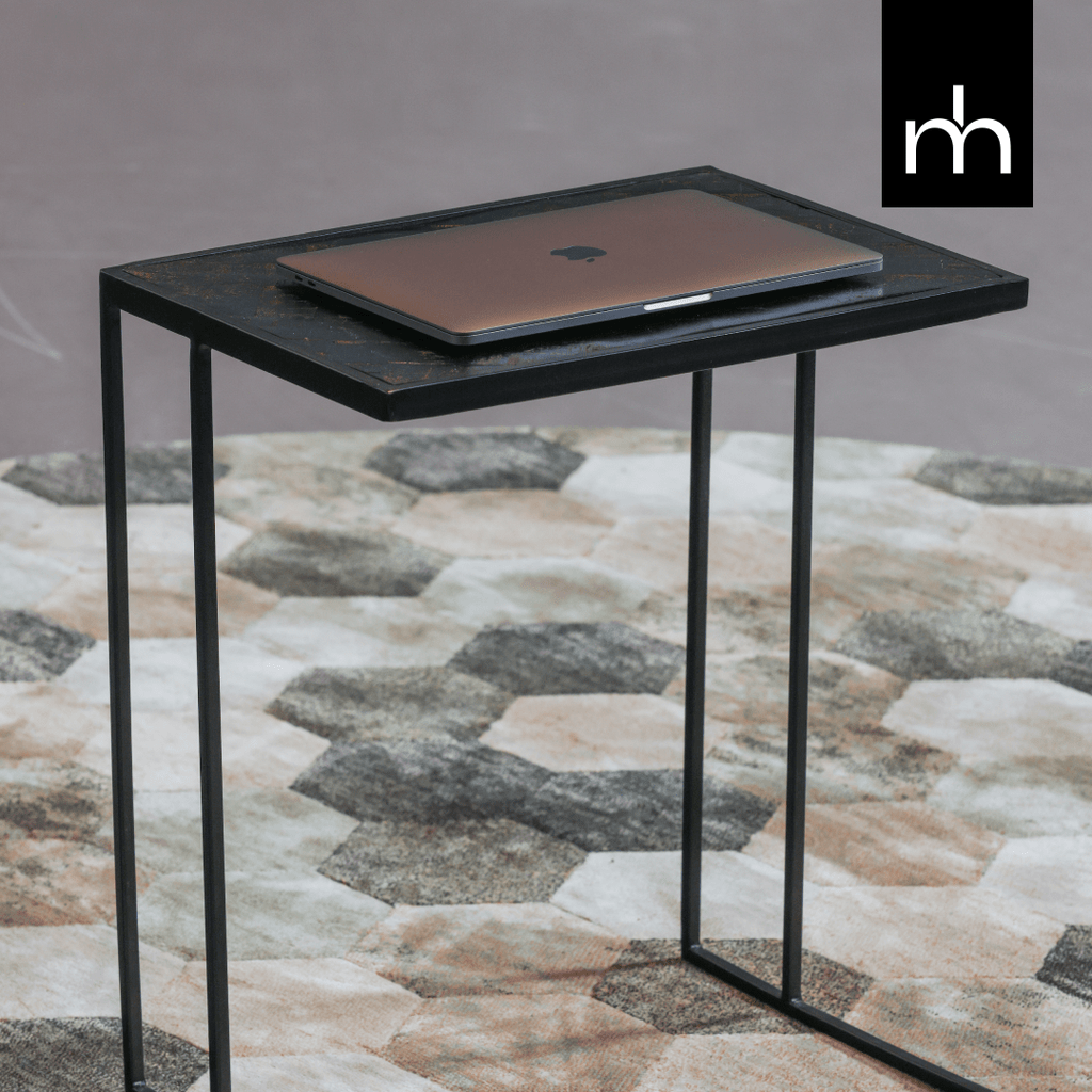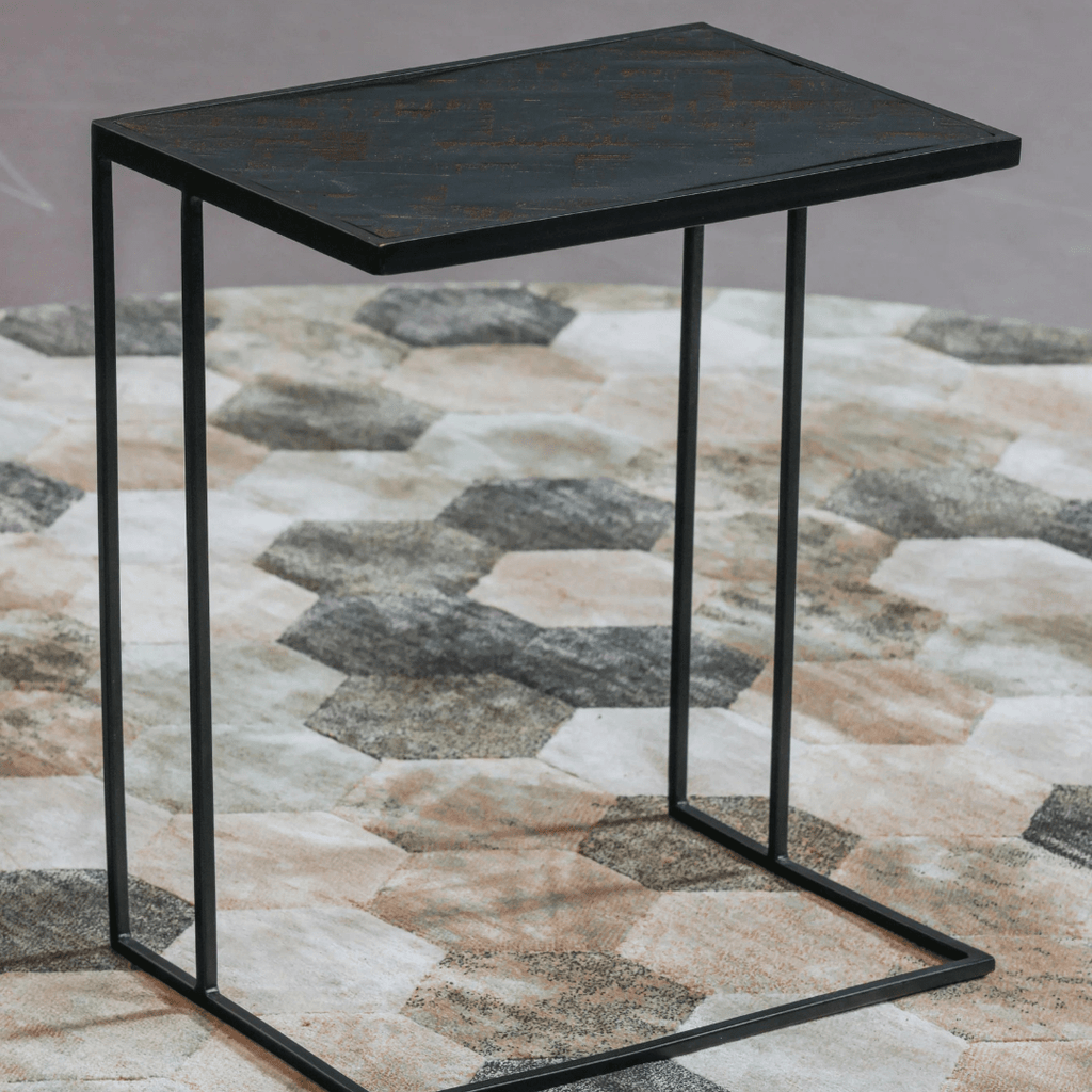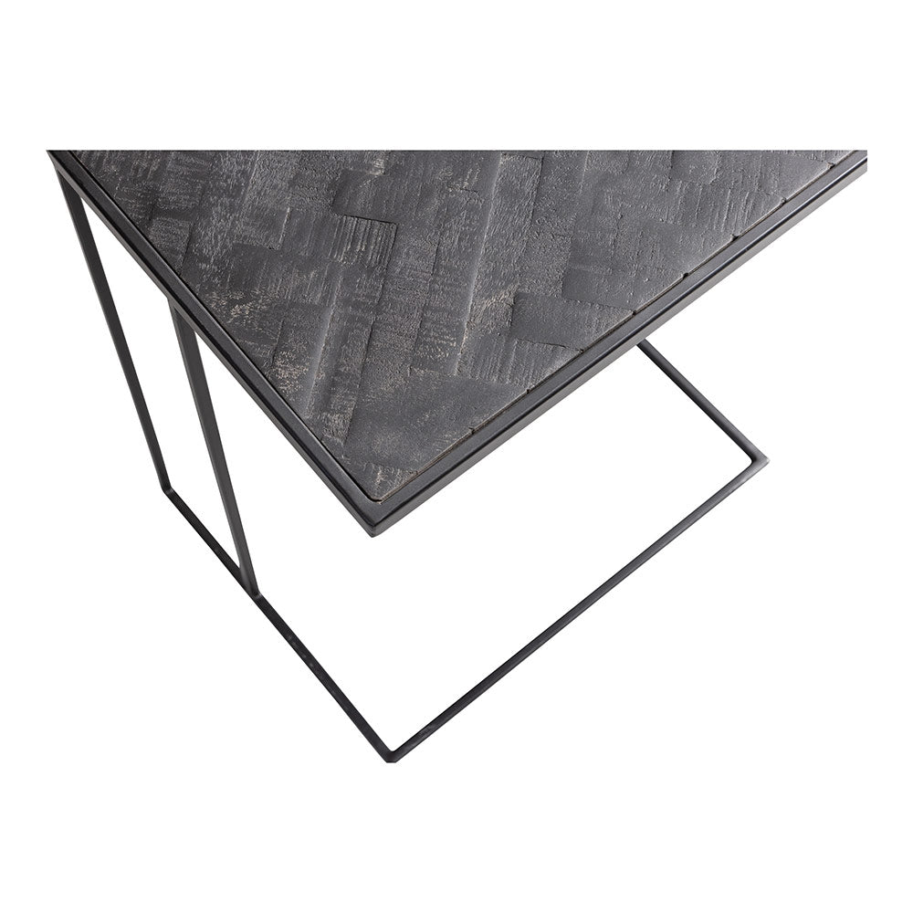 Masivní deska z mangového dřeva je nejprve opískována, poté ošetřena černým mořidlem a následně upravena tmavým přírodním včelím voskem na ochranu dřeva před vlhkostí, nečistotami a kroužky. Kovový rám je ošetřen černou práškovou barvou.